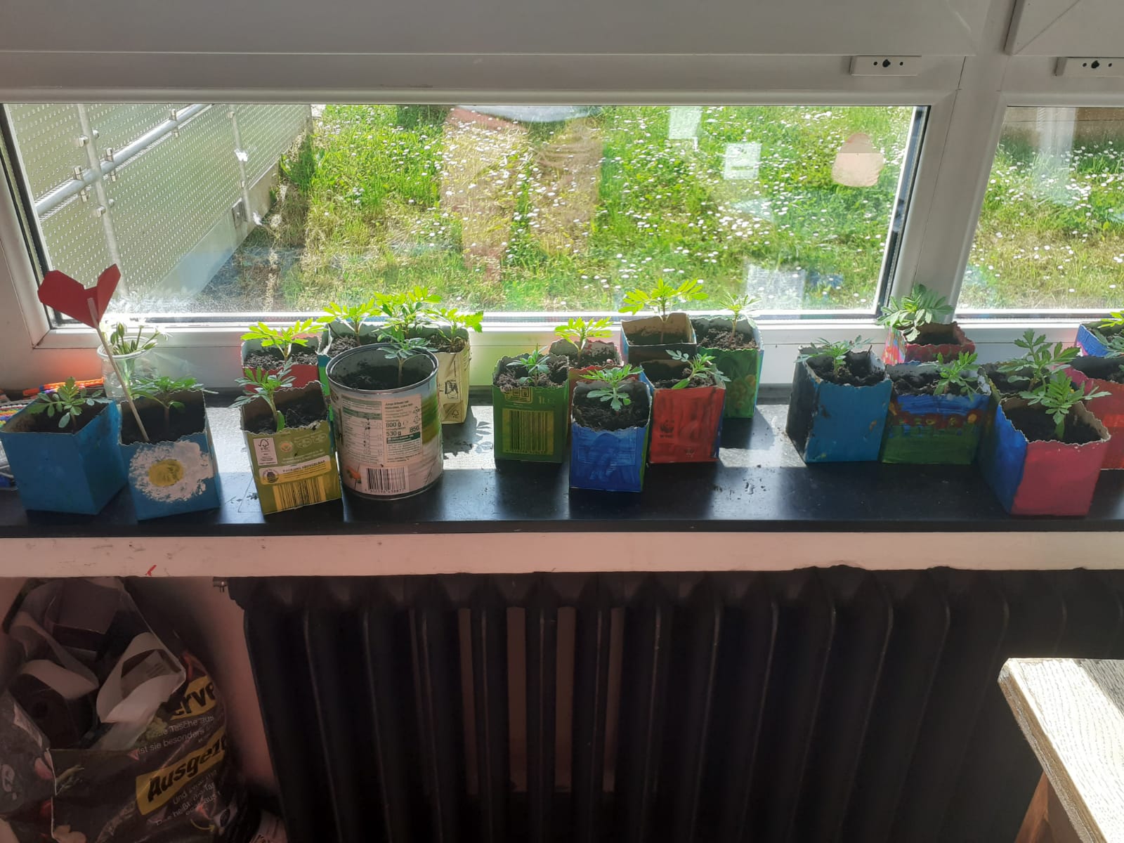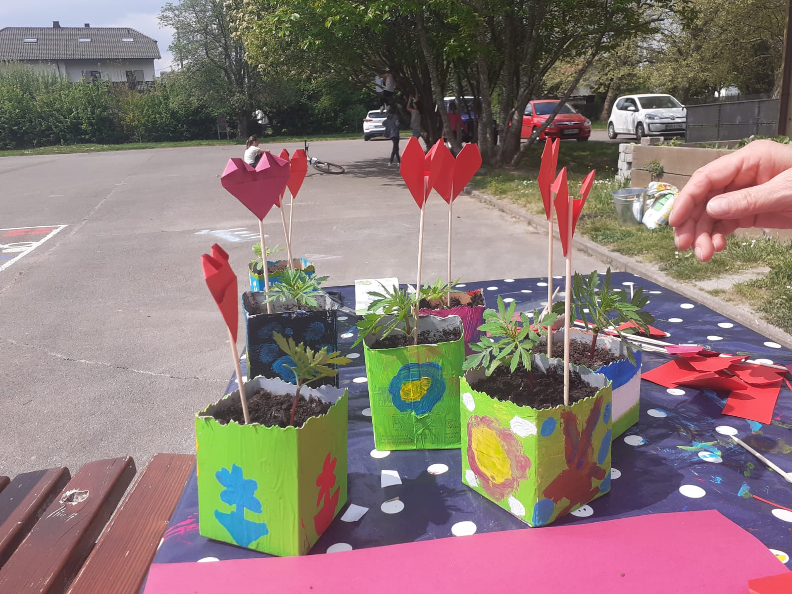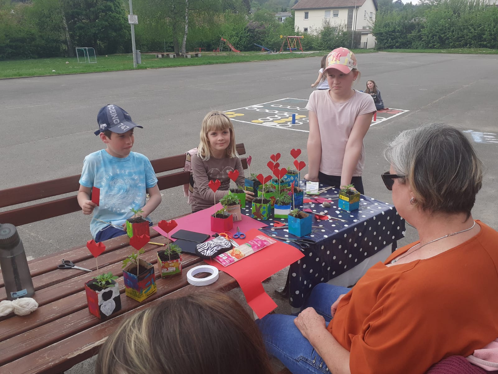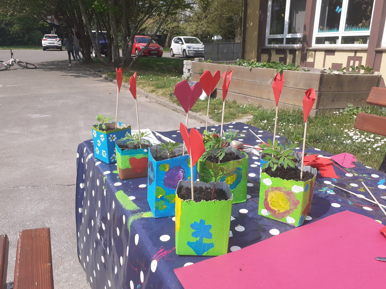Muttertagsgeschenke in der FGTS Ballweiler: aus selbst gezogenen Tagetes, angemalten Milchtüten und gefalteten Herzen. Ein voller Erfolg
