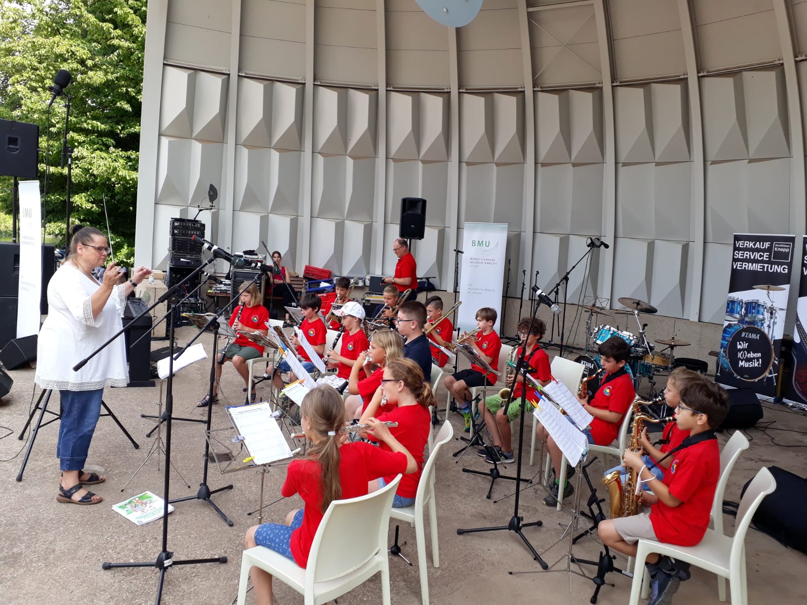 Kurz vor Beginn der Sommerferien luden das Kultusministerium und der BMU (Bundesverband Musikunterricht/Landesverband Saarland) zum alle zwei Jahre stattfindenden „Tag der Schulmusik“ ein, diesmal in den Deutsch-Französischen-Garten nach Saarbrücken. Unter dem Motto „Still Alive“ präsentierten sich insgesamt 16 Ensembles aus 12 Schulen des Saarlandes mit über 500 Musikerinnen und Musikern dem dankbaren Publikum. Auch unsere Bläserklasse hatte sich hierzu bereits im April angemeldet. Dies war natürlich coronabedingt zum damaligen Zeitpunkt ein Wagnis, denn keiner konnte wissen, wie sich die Lage bis Schuljahresende entwickelt. Dennoch haben unsere jungen Musikerinnen und Musiker fleißig zusammen mit ihren Instrumentallehrern geübt und letztlich Erstaunliches geleistet. Sowohl beim Schülerkonzert und Sommerkonzert des Musikvereins in der Würzbachhalle als auch beim Konzert in Saarbrücken konnten sie unter der Leitung ihrer Dirigentin Christine Welsch ihre Leistungsfähigkeit und Leistungsfreude unter Beweis stellen. Hans-Jürgen Geiger, Vorstandsmitglied des BMU Saar und gleichzeitig Projektleiter der Bläserklasse, durfte die begeisterten Dritt- und Viertklässler auf der Bühne des Musikpavillon bei strahlendem Wetter ansagen und etwas über dieses Projekt „Bläserklasse“ erzählen. Danach spielten die Kinder ihre Stücke ausgezeichnet, was mit einem großen Applaus auch der zahlreich mitgereisten Elternfans, der Rektorin Heidrun Bubeck-Wolf und der 1. Vorsitzenden des Musikvereins Hilde Krebs belohnt wurde. Insgesamt war dies ein sehr gelungener Abschluss des Schuljahres.