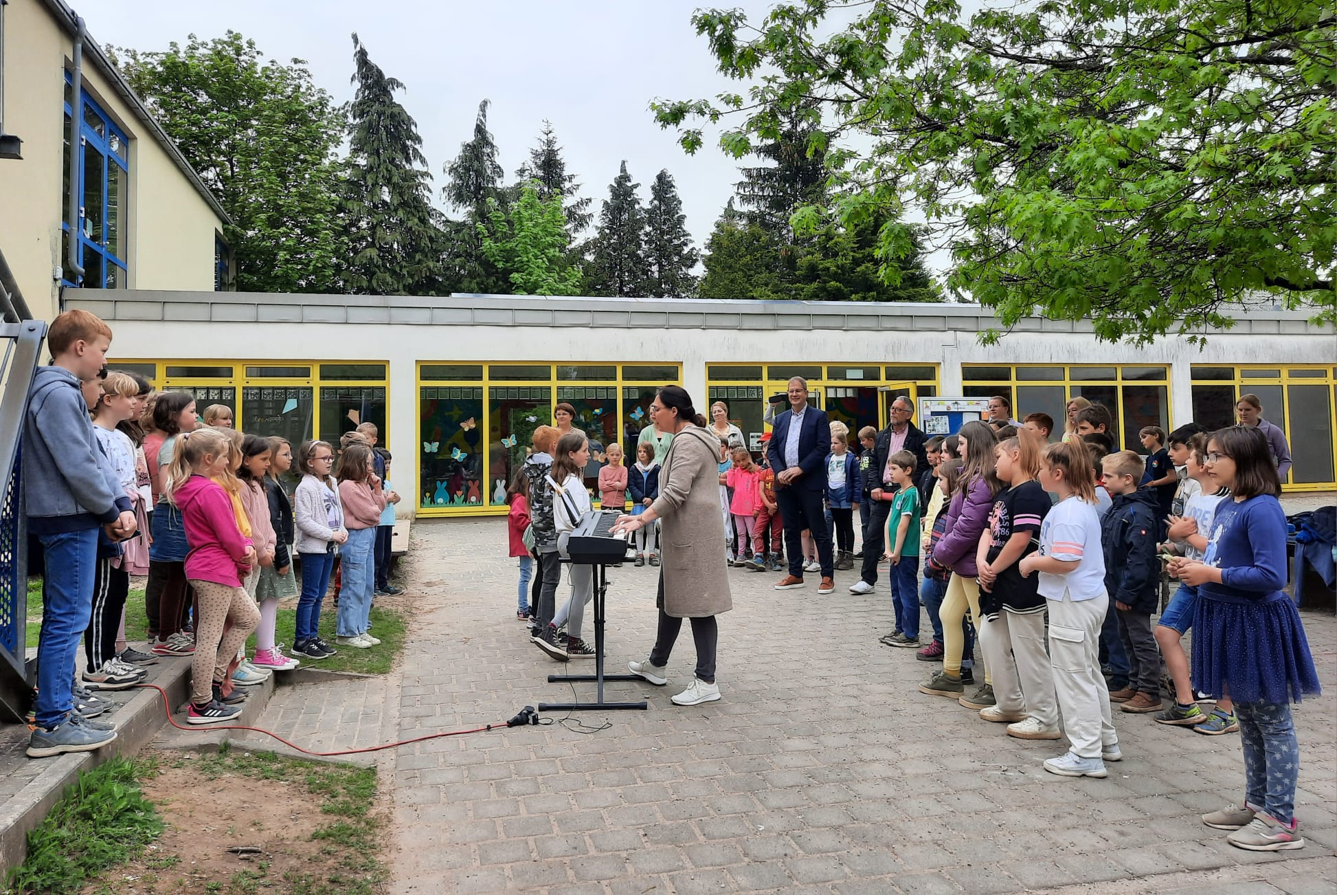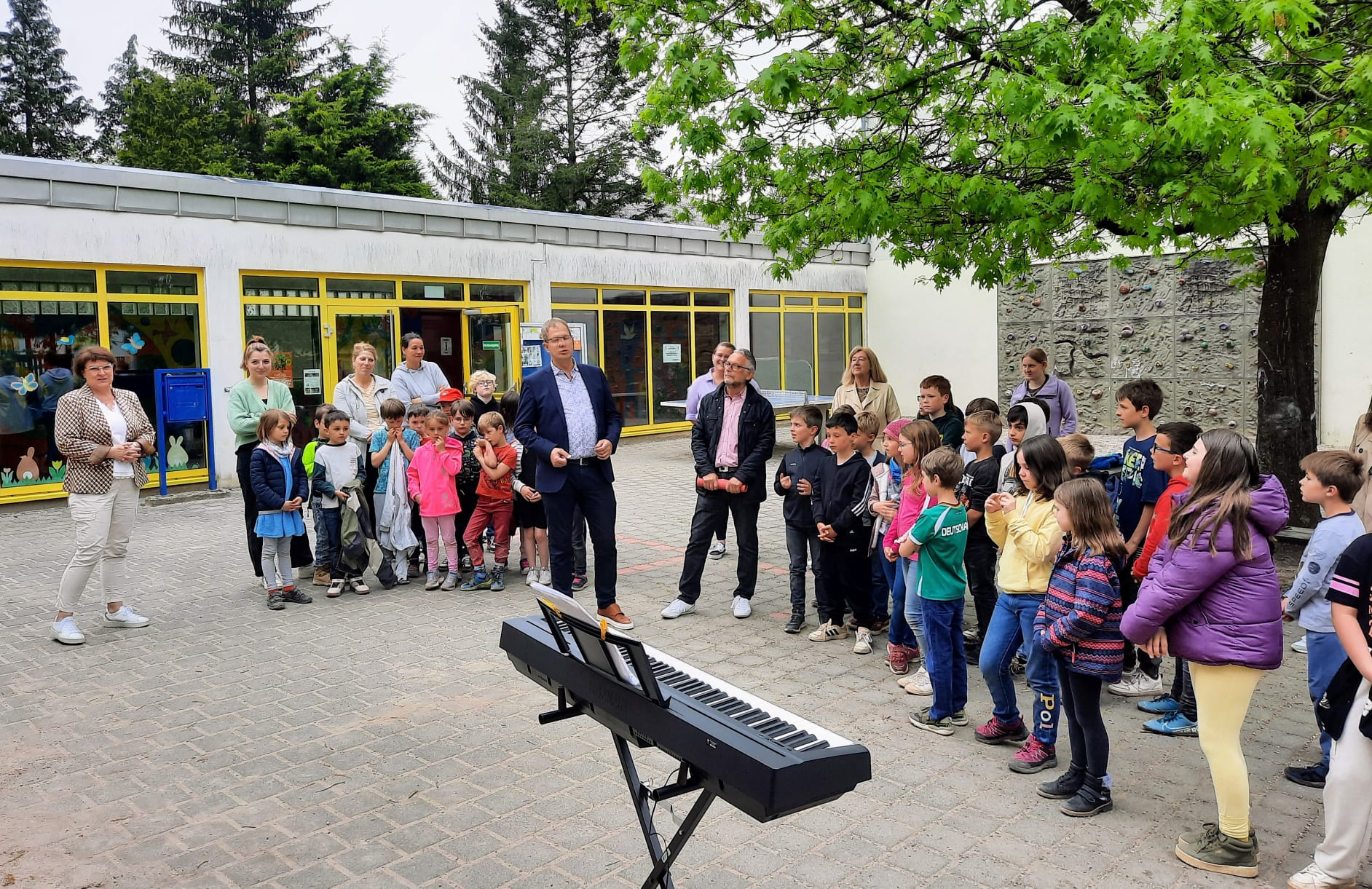 Am 08. Mai wurden feierlich die neuen Spielgeräte auf dem Schulhof in Aßweiler eingeweiht. Die Schülerinnen und Schüler, die Lehrerinnen, Integrationshelferinnen sowie die Schulleiterin freuten sich gemeinsam mit dem Bürgermeister, seinem für die Schulen zuständigen Beigeordneten, den Mitarbeiterinnen des Schulamtes sowie den Mitarbeitern des Bauhofes über die Übergabe der Spielgeräte. Die Chor-AG "Das singende Klassenzimmer" trug mit zwei besonders schönen Liedern zu einer gelungenen Einweihungsfeier bei.
