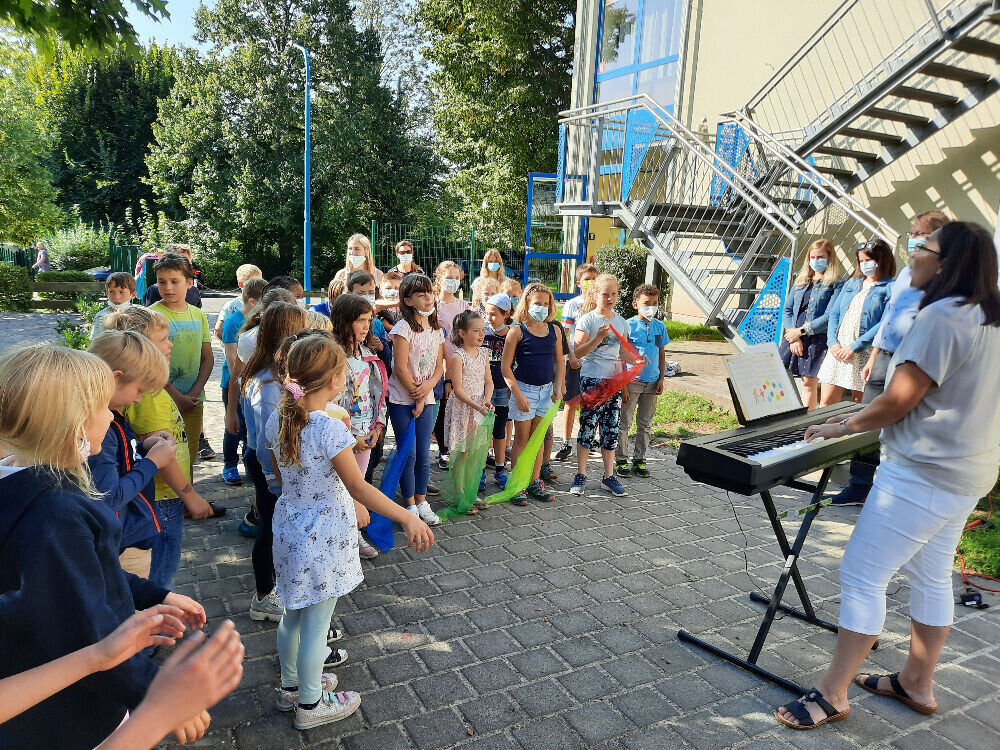Am 06. September 2021 besuchte unser Bürgermeister Bernd Hertzler gemeinsam mit den Mitarbeiterinnen des Schulwesen Frau Jung und Frau Zäh sowie dem Personalbeauftragten Herr Brengel unsere Dependance in Aßweiler. Begrüßt wurden die Gäste von der zweiten und dritten Klasse mit den beiden Liedern „Hey, hallo, willkommen in der Schule“ und „Ich bin anders als du“, welche von Frau Betz am E-Piano begleitet wurden. Anschließend hieß Her Hertzler die 20 neuen Erstklässler willkommen, übergab ihnen ein Buchpräsent und wünschte ihnen eine schöne und erlebnisreiche Schulzeit.