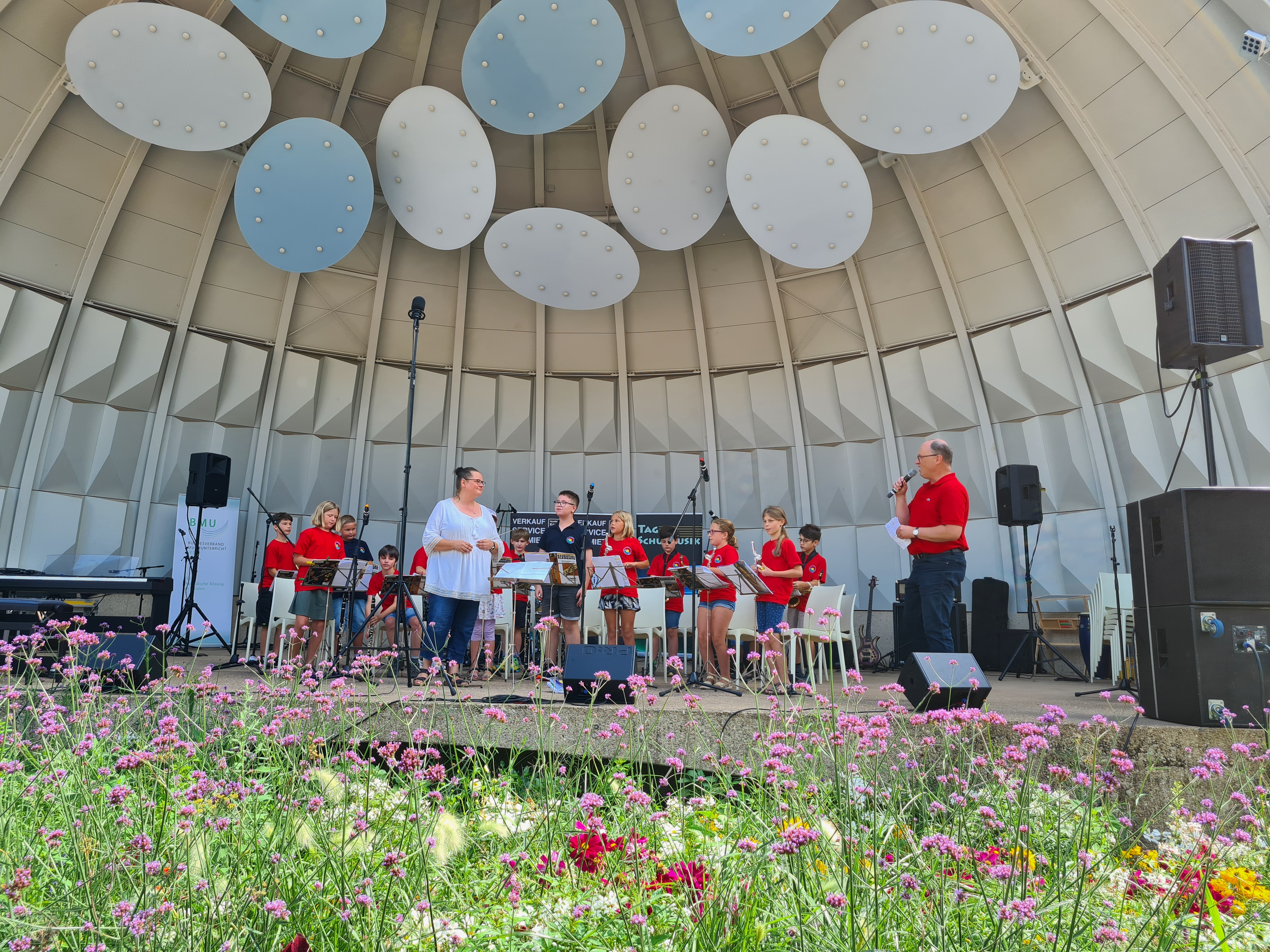 Kurz vor Beginn der Sommerferien luden das Kultusministerium und der BMU (Bundesverband Musikunterricht/Landesverband Saarland) zum alle zwei Jahre stattfindenden „Tag der Schulmusik“ ein, diesmal in den Deutsch-Französischen-Garten nach Saarbrücken. Unter dem Motto „Still Alive“ präsentierten sich insgesamt 16 Ensembles aus 12 Schulen des Saarlandes mit über 500 Musikerinnen und Musikern dem dankbaren Publikum. Auch unsere Bläserklasse hatte sich hierzu bereits im April angemeldet. Dies war natürlich coronabedingt zum damaligen Zeitpunkt ein Wagnis, denn keiner konnte wissen, wie sich die Lage bis Schuljahresende entwickelt. Dennoch haben unsere jungen Musikerinnen und Musiker fleißig zusammen mit ihren Instrumentallehrern geübt und letztlich Erstaunliches geleistet. Sowohl beim Schülerkonzert und Sommerkonzert des Musikvereins in der Würzbachhalle als auch beim Konzert in Saarbrücken konnten sie unter der Leitung ihrer Dirigentin Christine Welsch ihre Leistungsfähigkeit und Leistungsfreude unter Beweis stellen. Hans-Jürgen Geiger, Vorstandsmitglied des BMU Saar und gleichzeitig Projektleiter der Bläserklasse, durfte die begeisterten Dritt- und Viertklässler auf der Bühne des Musikpavillon bei strahlendem Wetter ansagen und etwas über dieses Projekt „Bläserklasse“ erzählen. Danach spielten die Kinder ihre Stücke ausgezeichnet, was mit einem großen Applaus auch der zahlreich mitgereisten Elternfans, der Rektorin Heidrun Bubeck-Wolf und der 1. Vorsitzenden des Musikvereins Hilde Krebs belohnt wurde. Insgesamt war dies ein sehr gelungener Abschluss des Schuljahres.