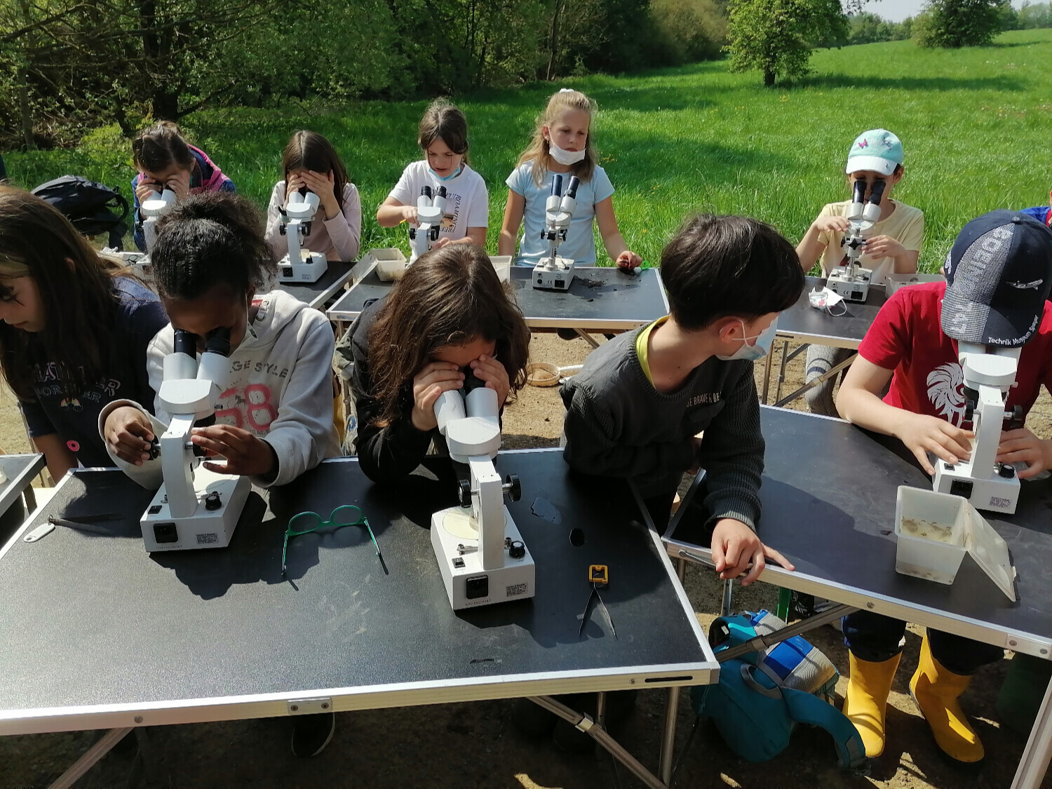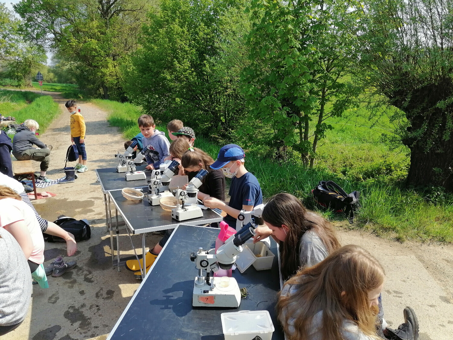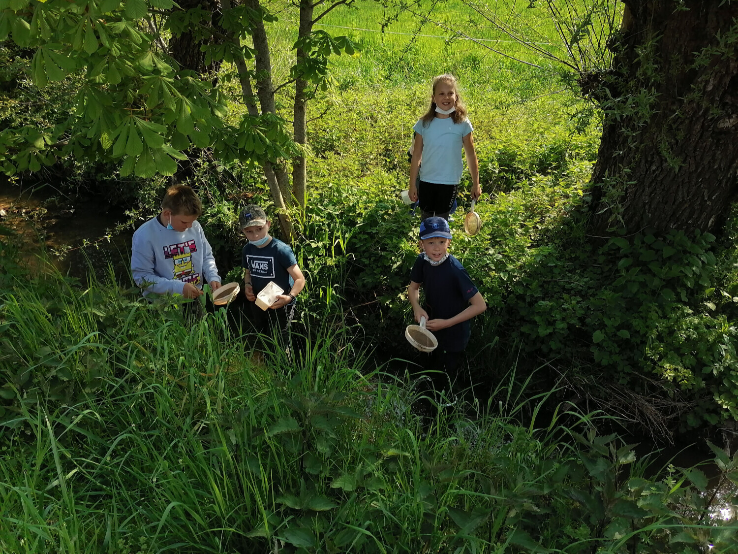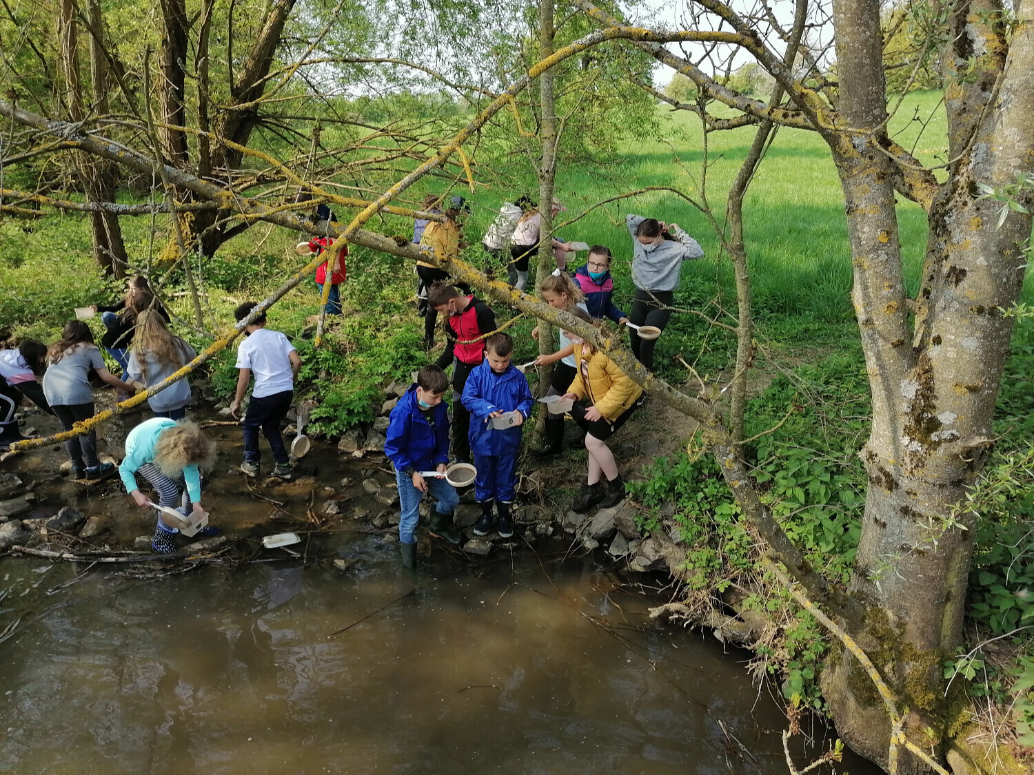 Am 04. Mai durften die Kinder der Klassen 3.2 und 4.2 ihr Klassenzimmer gegen den außerschulischen Lernort „Mandelbach“ eintauschen. Bei schönstem Frühlingswetter machten sie sich auf den Weg, um vor Ort mit allen Sinnen zu forschen. Gemeinsam mit Herrn Potel vom KunterBUNDmobil konnten die Kinder anschaulich erfahren, wie viel Wasser jeder von uns pro Tag verbraucht – sage und schreibe 120 l pro Tag! Mit großer Begeisterung konnten die Jungs und Mädels anschließend in den Bach, um mit Sieb und Sammelbox jede Menge Wassertiere zu fangen, die am Ende unter den Mikroskopen genauer betrachtet werden durften. Wasserläufer, Egel, Larven, Schnecken, Wasserskorpione – all diese Tiere galt es nun zu untersuchen. Dieser erlebnis- und lehrreiche Unterrichtsmorgen ging leider viel zu schnell vorbei, wird den Kindern aber sicher noch lange in Erinnerung bleiben.