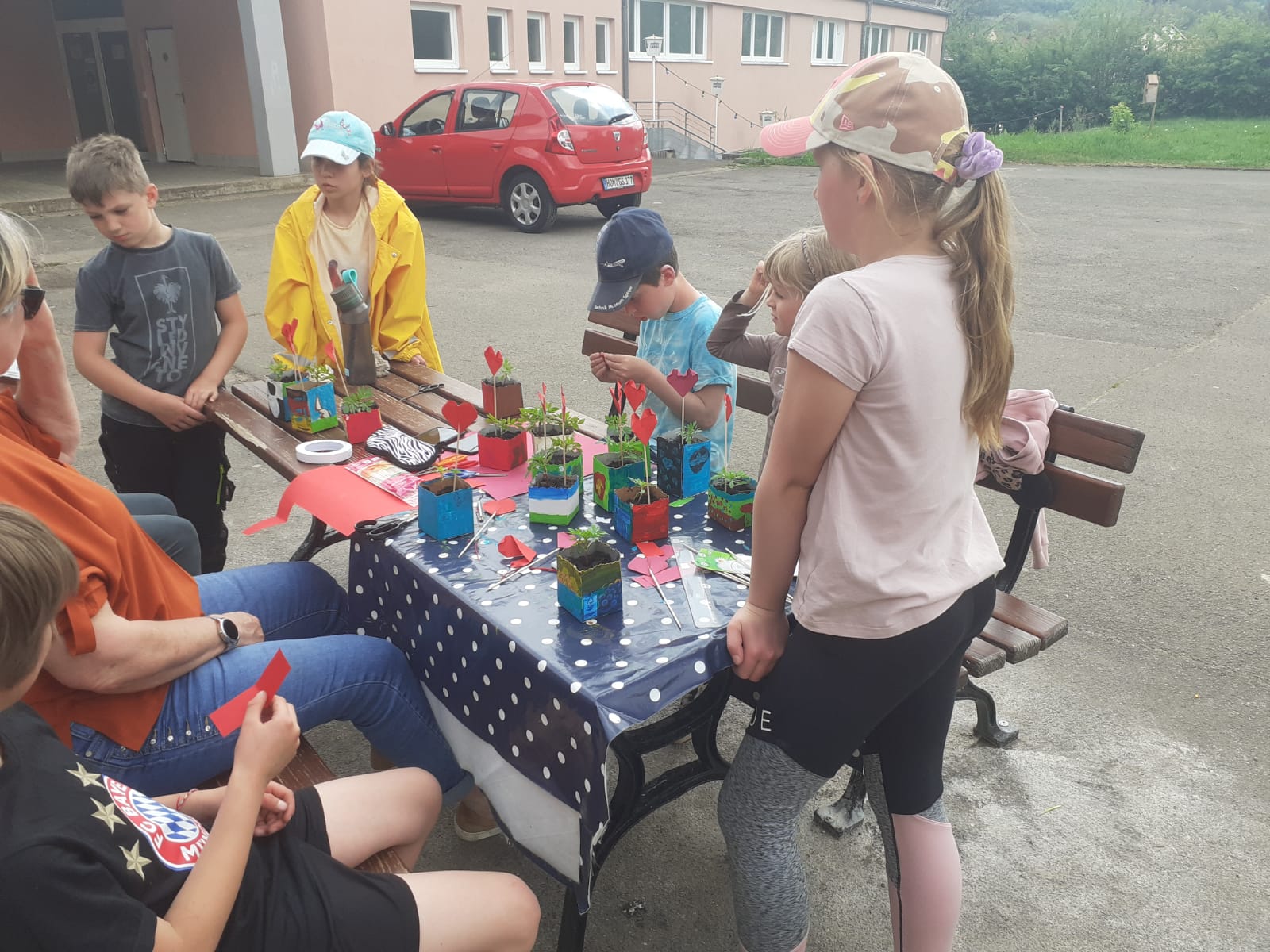 Muttertagsgeschenke in der FGTS Ballweiler: aus selbst gezogenen Tagetes, angemalten Milchtüten und gefalteten Herzen. Ein voller Erfolg