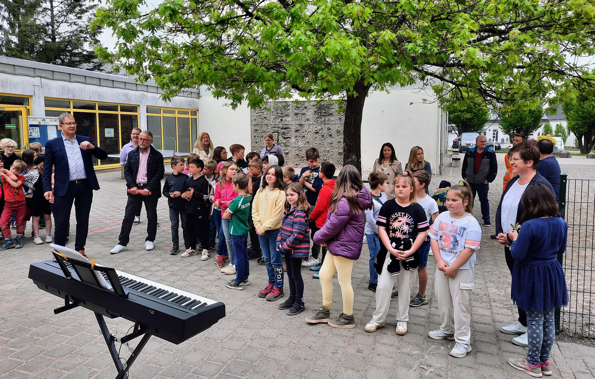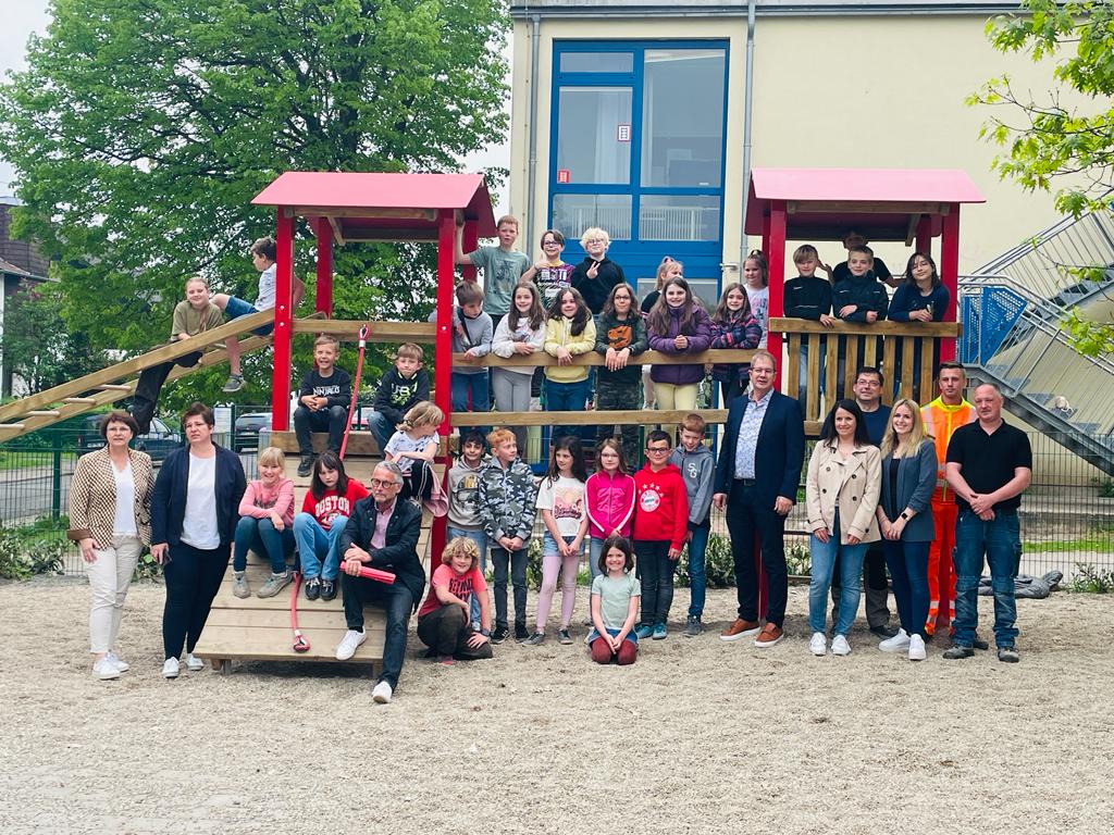 Am 08. Mai wurden feierlich die neuen Spielgeräte auf dem Schulhof in Aßweiler eingeweiht. Die Schülerinnen und Schüler, die Lehrerinnen, Integrationshelferinnen sowie die Schulleiterin freuten sich gemeinsam mit dem Bürgermeister, seinem für die Schulen zuständigen Beigeordneten, den Mitarbeiterinnen des Schulamtes sowie den Mitarbeitern des Bauhofes über die Übergabe der Spielgeräte. Die Chor-AG "Das singende Klassenzimmer" trug mit zwei besonders schönen Liedern zu einer gelungenen Einweihungsfeier bei.
