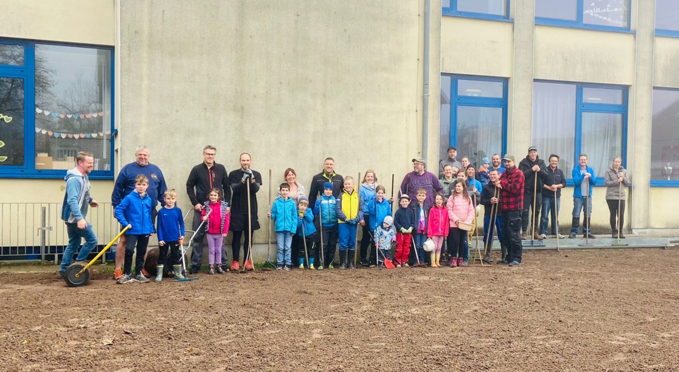 Viele Eltern und Kinder halfen den Boden vorzubereiten und mit robustem Rasen einzusäen.